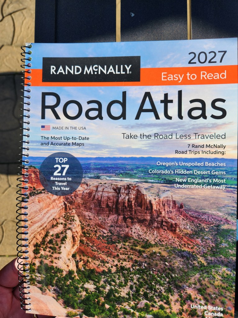 I was in Barnes & Noble this week and was delighted to see a bunch of road atlases! After looking through the different styles, I decided that I needed to have one for our trip. One reason is that technology isn’t always dependable, it would be a good idea to have paper maps with us in case we encounter areas without good Wi-Fi/satellite coverage. Second, my hubby is a “big picture” kind of guy. He likes to have sense of where he’s headed and what to be expecting along the way. It has already been helpful for him to calculate how far we’ll go in a day and which cities to begin looking for hotels to stay at each night. Thirdly, and probably the real reason I want a road atlas is purely nostalgic.